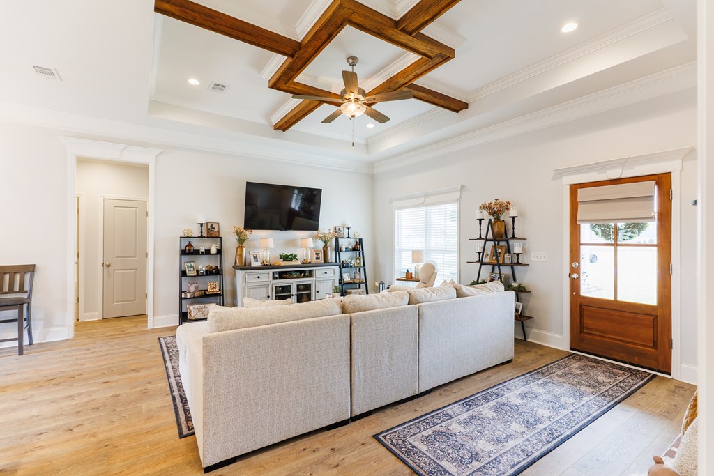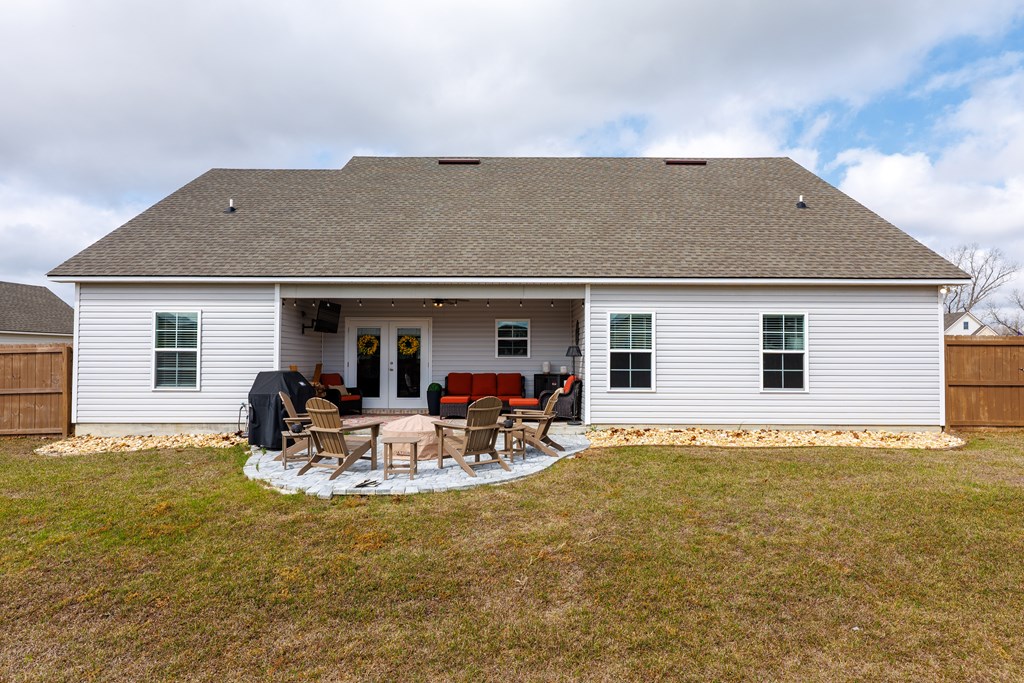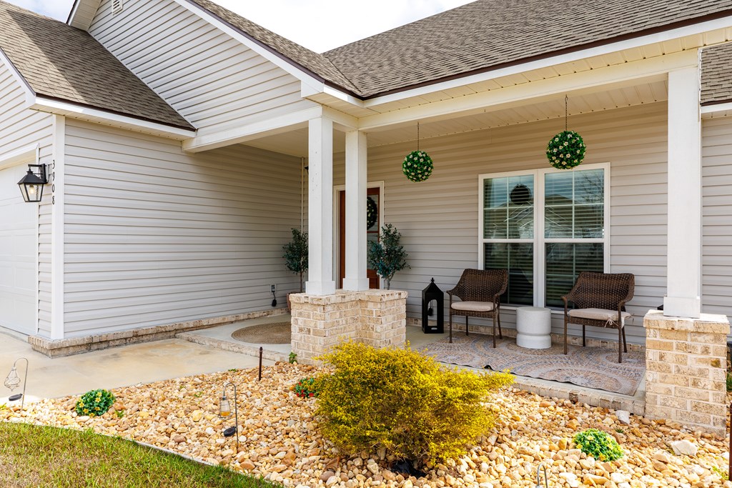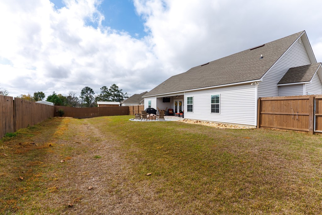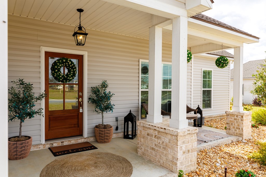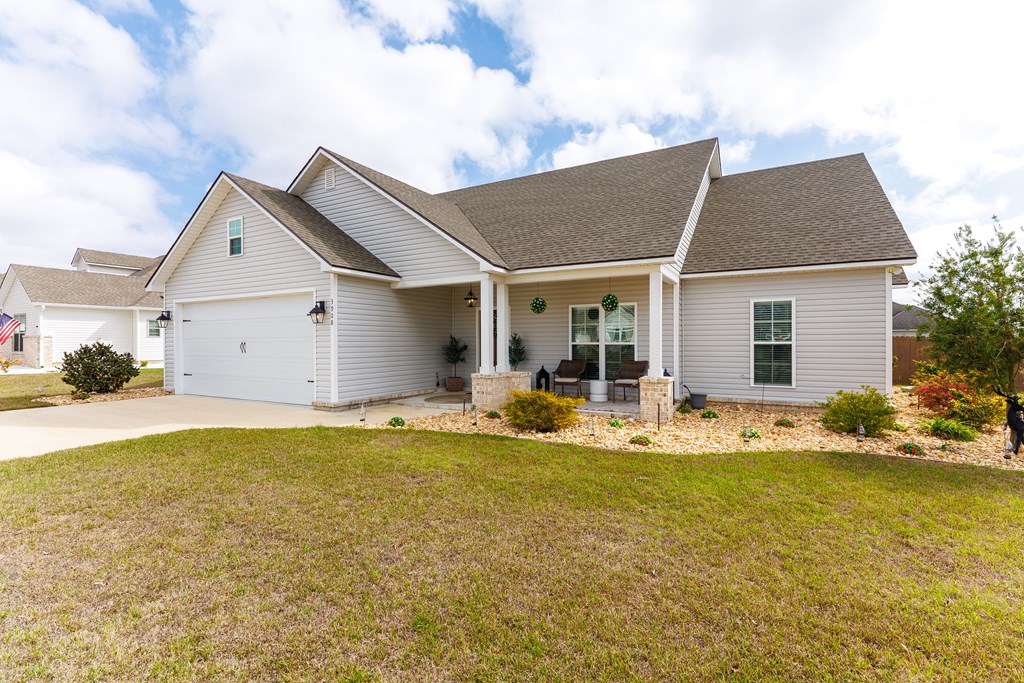 Welcome to this three-bedroom, two-bath home located in the Cattle Crossing Subdivision. The neighborhood offers a single entrance and exit for added privacy and is conveniently located to Moody Air Force Base.The front porch welcomes you into the home. Inside, there's attractive woodwork on the living room ceiling. The kitchen features custom cabinets, quartz countertops, under cabinet lighting, a custom pantry, and stainless steel appliances. It leads to a covered back porch and a brick paver area, perfect for chairs and a fire pit. The yard is fenced with privacy fencing.The primary suite is spacious, with a separate soaking tub ,a tile shower, white Carrera quartz countertops.and a wraparound walk-in custom closet. The laundry room includes extra cabinetry and quartz countertops. The other two bedrooms share a bathroom, and the light colors throughout the home provide a bright atmosphere.This home offers a blend of comfort and functionality in a quiet setting.
