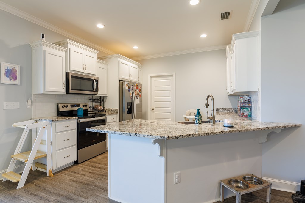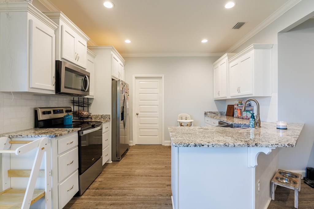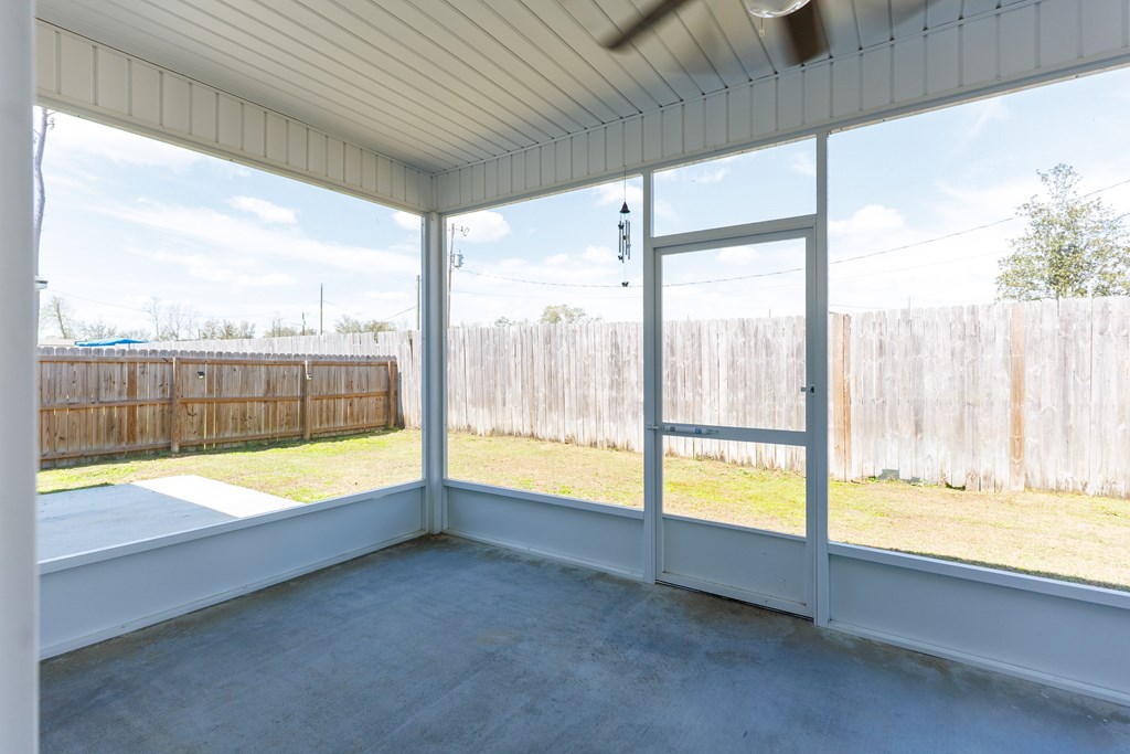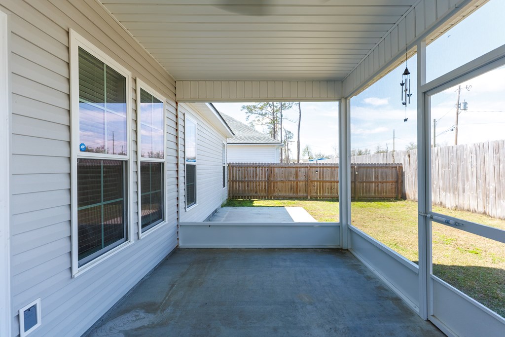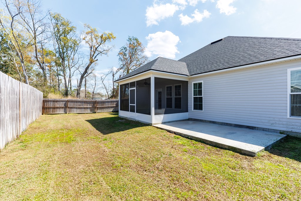 Welcome to this beautifully designed 4 bedroom, 2 bathroom home in Val Del Villas where thoughtful upgrades and stylish details create a space that truly stands out. From the moment you arrive, the charming curb appeal is highlighted by classic wood shutters that add warmth and character to the exterior. Step inside to a welcoming foyer that opens into a spacious living room featuring a stunning wood-accented tray ceiling that creates an eye-catching focal point. The open layout flows seamlessly into the dining area and kitchen, making the space ideal for everyday living and entertaining. The kitchen is both stylish and functional, complete with granite countertops, white cabinetry, a tiled backsplash, stainless steel appliances, and a large peninsula island perfect for barstool seating. The pantry with custom wood shelving provides excellent storage and organization. Designed with a split floor plan, the primary suite offers a private retreat featuring a beautiful wood-accented tray ceiling, shiplap wall detailing, and a sliding barn door leading into the bathroom. The primary bath includes granite countertops, wood-trimmed mirrors, a built-in vanity space, and a fully tiled dual shower for a spa-like finish. On the opposite side of the home, you'll find three additional bedrooms and a well-appointed secondary bathroom with granite countertops and quality finishes throughout. Step outside to enjoy the screened-in back patio and extended open patio, the perfect place to relax or entertain while enjoying the outdoors. Additional upgrades include a full-home water softener system, epoxy flooring in the two-car garage, and a security system for added convenience and peace of mind. Conveniently located just minutes from Moody Air Force Base. USDA eligible and termite bonded!