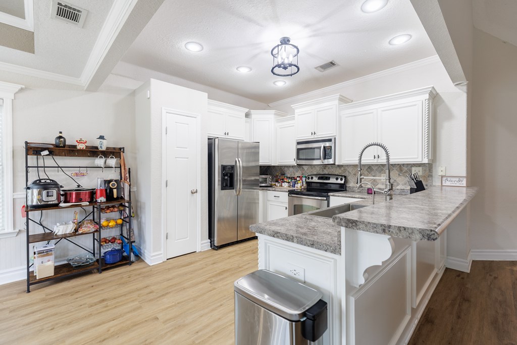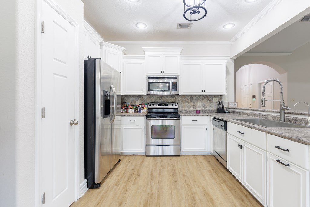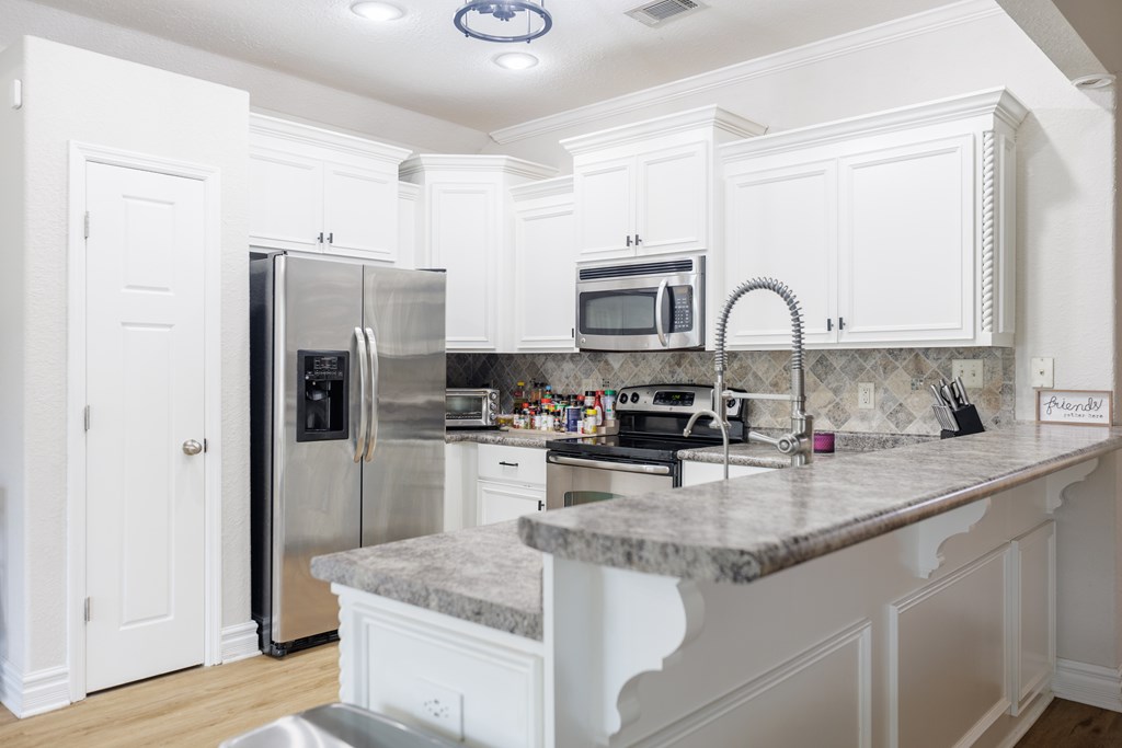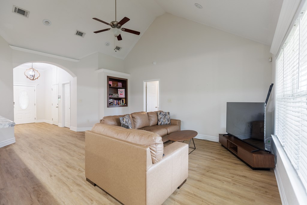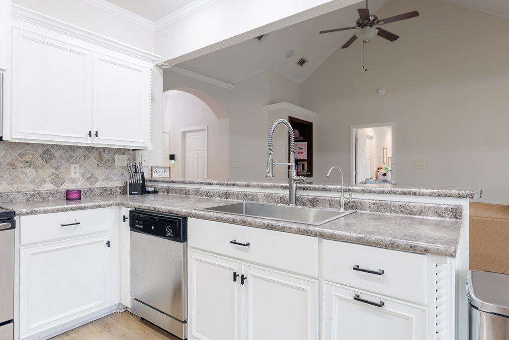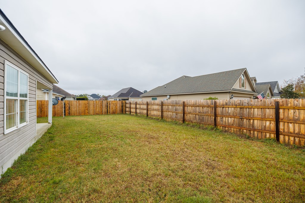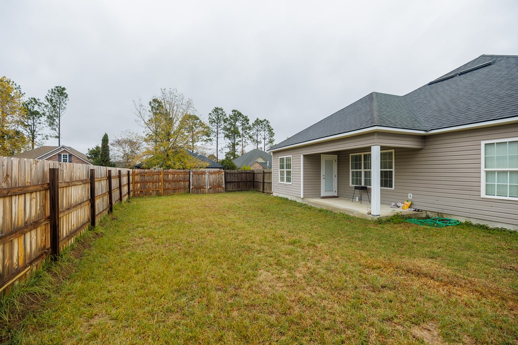 Welcome home to this beautifully maintained 3 bedroom, 2 bathroom property in the beautiful Glen Laurel Subdivision, just minutes from Moody Air Force Base and zoned Lowndes County schools. Step inside and you're greeted by a welcoming foyer that flows seamlessly into the spacious vaulted living room, filled with natural light and offering a perfect view straight through to the backyard. The open-concept layout makes this space feel airy and connected, with the living room opening directly into the dining area and kitchen. The kitchen features stainless steel appliances, a pantry for extra storage, and a peninsula island with bar seating, ideal for casual meals or entertaining friends and family. The split floor plan places the two guest bedrooms at the front of the home, each a great size with easy access to the full hall bathroom. On the opposite side, tucked privately off the living room, you'll find the spacious primary suite. This retreat includes double vanities, two walk-in closets, a relaxing soaker tub, and a large walk-in shower. Step out back to enjoy your covered patio overlooking the privacy fenced yard, perfect for pets, grilling, or watching kids play. The home sits on a corner lot, offering a little extra space and great curb appeal. Just around the corner is the Glen Laurel neighborhood park, green space, and walking trail, making this community a favorite for those wanting convenience, charm, and outdoor amenities.