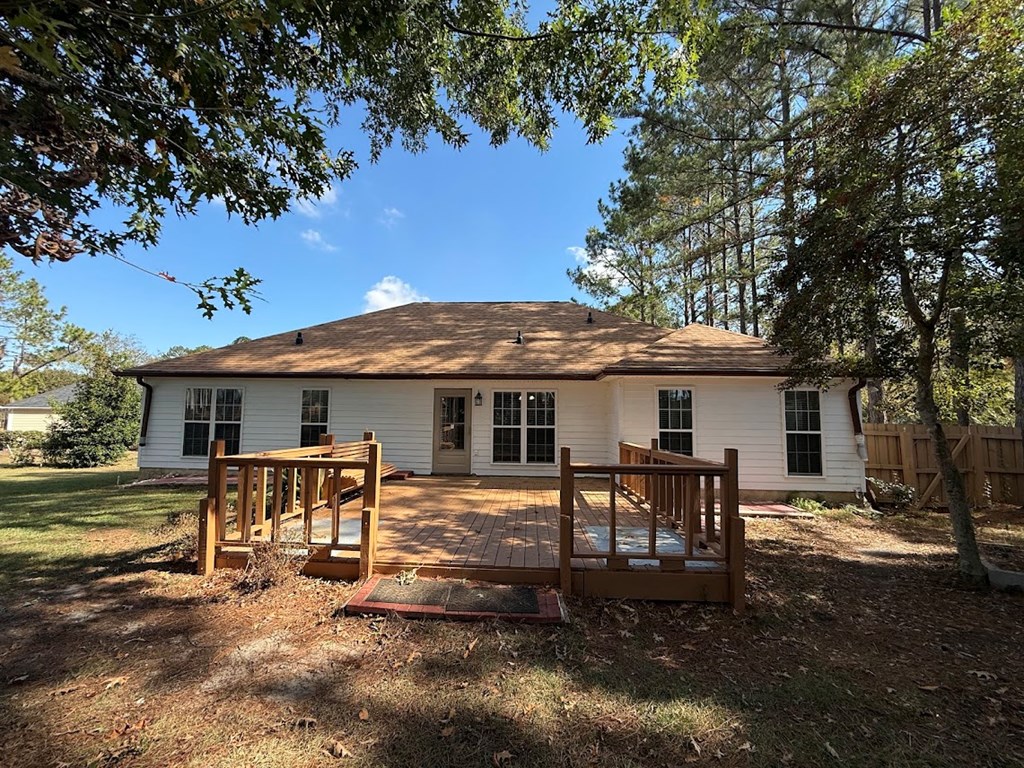 Welcome home to 3833 Chris Circle in beautiful Kingston Estates! This property offers the ideal combination of quiet, comfortable living and exceptional convenience to Valdosta, Lowndes County, and Moody Air Force Base. Located in a quiet cul-de-sac and situated on a generous, nearly half-acre lot, this home feels private and secluded. Step inside to a spacious, bright living room featuring durable, low-maintenance tile floors that extend through the main living areas. The living room flows semi-openly to the breakfast nook and kitchen, creating an easy layout for daily life. The kitchen is functional and attractive, featuring granite countertops, a tile backsplash, and all major appliances included, along with a nice-sized pantry. For larger meals or entertaining, there is a formal dining room at the front of the home. The property features a desirable split-bedroom floor plan for maximum privacy. The primary bedroom is on its own side of the house with a private en suite bath and a large walk-in closet. Two additional bedrooms share a nice-sized guest bathroom, providing comfortable accommodations. Outside, enjoy the spacious deck, which is perfect for grilling and relaxing in the private backyard. You'll also benefit from the included 15x7 storage shed for extra storage. Additional key features include a large, dedicated indoor laundry room for ultimate convenience, and a two-car garage that is currently framed out for potential use as a home office space and a workbenchperfect for hobbies or telecommuting. Enjoy easy access to both MAFB and Valdosta which offers- Valdosta State University, major retail and dining areas near I-75, and Wild Adventures Theme Park and much more! Schedule a tour today and see why this practical, well-located, and comfortable home in Kingston Estates is the right fit for your next move!