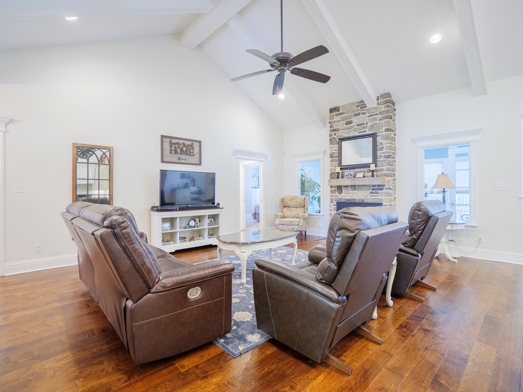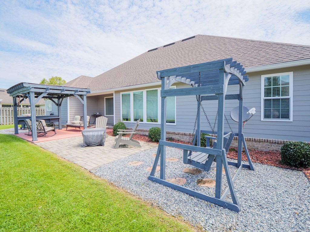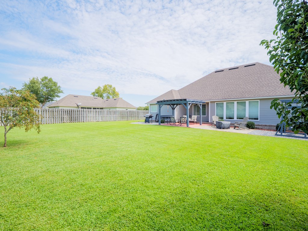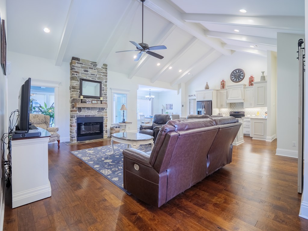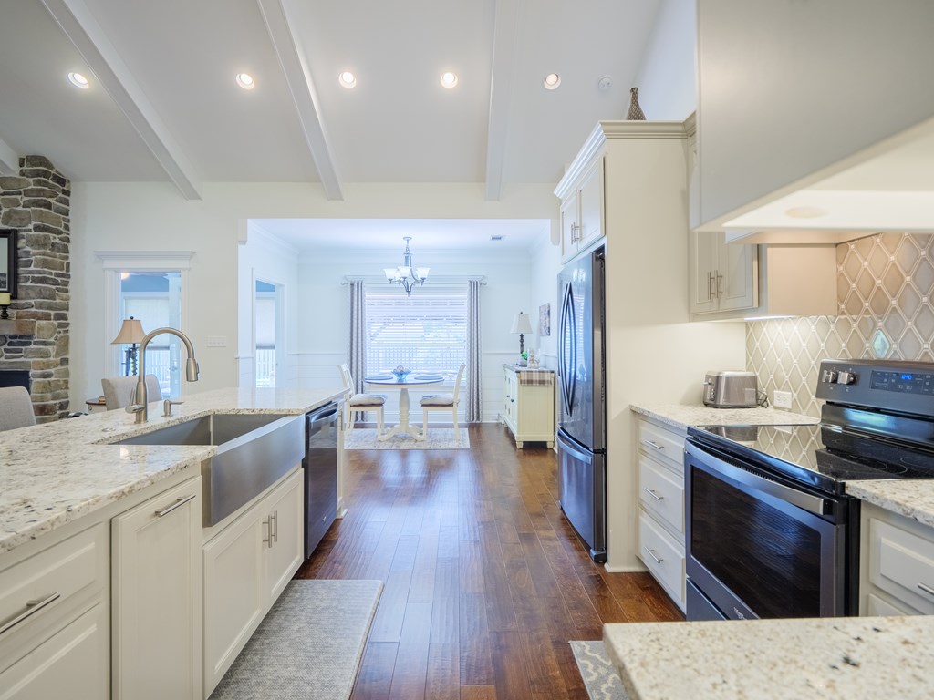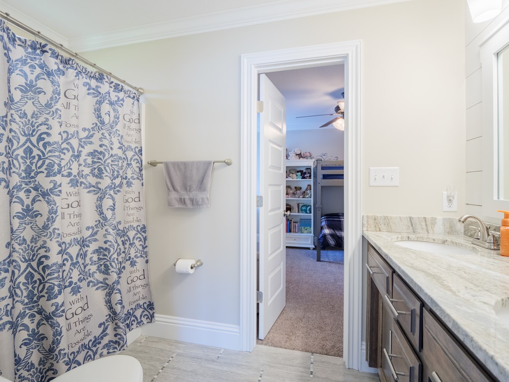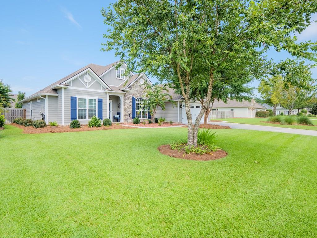 Located in the prestigious Kinderlou Forest Subdivision, this one-owner home built by Dixon Taylor Construction has been impeccably maintained. It could still easily pass as new construction! Featuring 4 bedrooms and 3 full baths, each bedroom offers private bath access for comfort and convenience. The open living room boasts a stone fireplace and flows seamlessly into the beautiful kitchen with granite countertops, tile backsplash, and abundant custom cabinetry. The spacious master suite includes two large walk-in closets, an en-suite bath with dual vanities, a corner soaking tub, tiled walk-in shower, and private water closet. Wood floors enhance much of the home, and the rear sunroom provides flexible living space with a pretty view of the patio sitting area in the fenced in back yard. A large 2-car garage plus a 3rd bay is perfect for golf carts, bikes, or storage. Enjoy manicured landscaping in both front and back yards. Community amenities include a staffed gated entrance, pools, tennis and pickleball courts, chapel, restaurant, playground, fitness center, and the renowned Davis Love III designed golf course. Truly a beautiful home! For more information on Kinderlou Forest S/D, visit their website at https://www.kinderlou-golf.com.